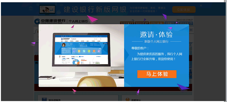 自3月27日起,我行面向全国客户诚邀体验,您可点击现有网银上方邀请链接抢先体验新版网银。
