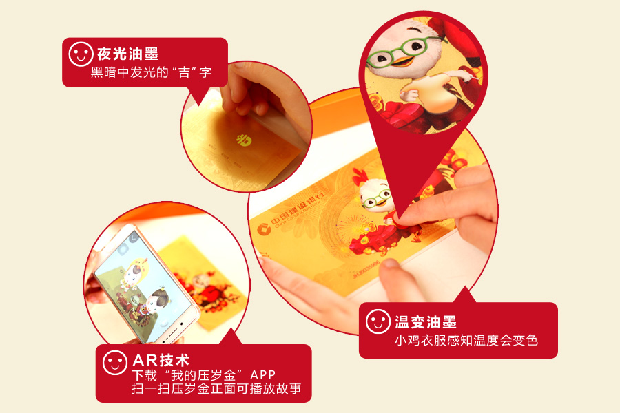 中国建设银行鸡年压岁金,不仅满足了孩子们的好奇心,更带来了前所未有的智能互动体验。在超薄黄金彩印工艺的基础上,加入全新AR技术和温变油墨工艺,为小朋友带来会讲故事、会变装的黄金压岁钱,好看更好玩。